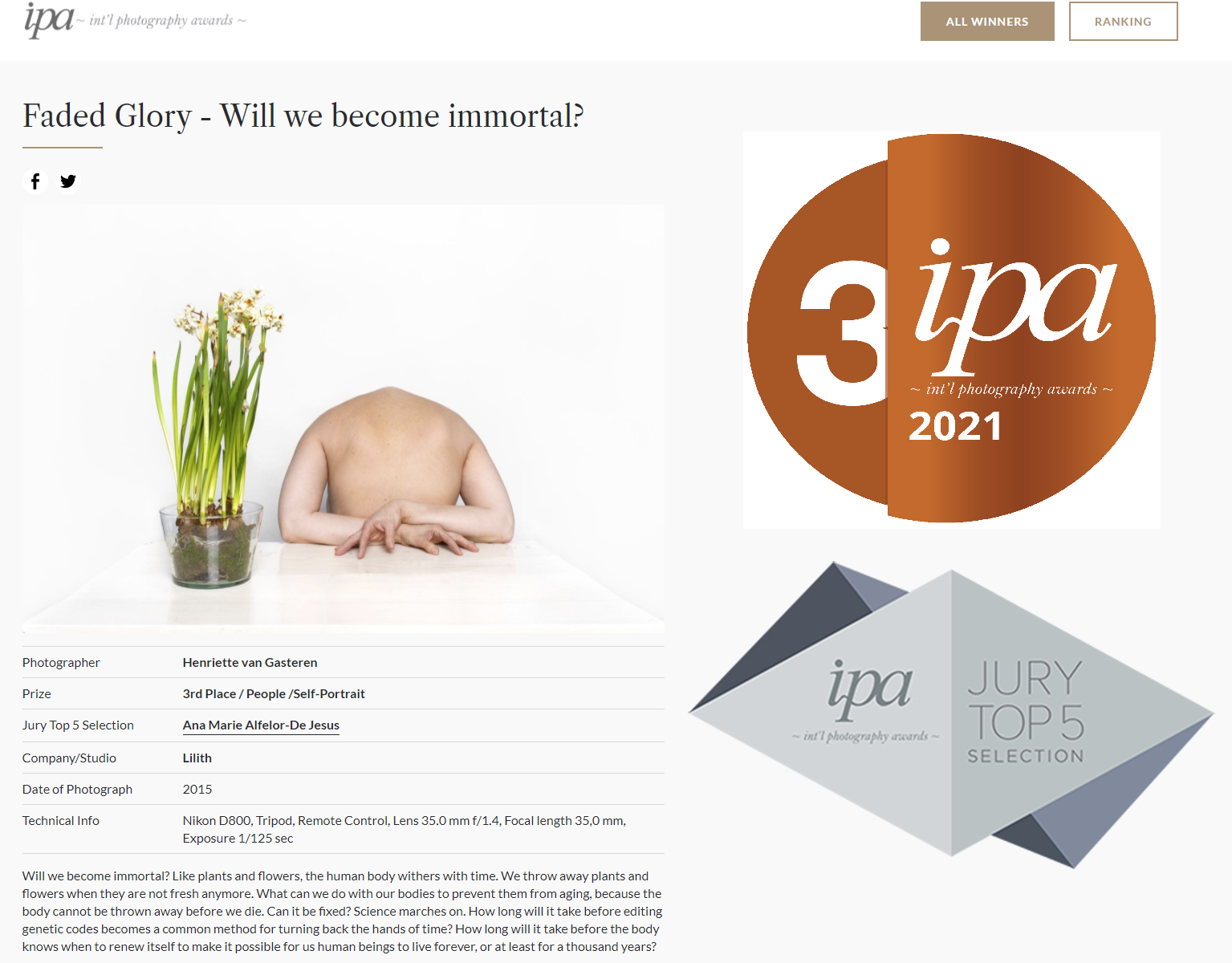 Derde prijs en jury top 5 bij International Photography Awards 2021 in de categorie People – Self-portrait met een deel van mijn serie: ‘Faded Glory’ – Will we become immortal?