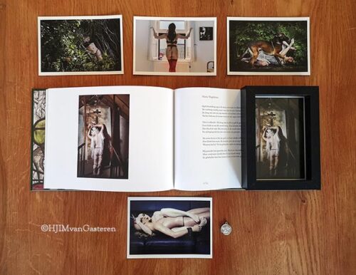 Aanbieding voor de feestdagen of gewoon tussendoor! Slechts 60 euro inclusief verzending in Nederland. Je ontvangt het boek ‘Over Hoeren & Madonna’s’. Bijbelvrouwen in een ander perspectief en een set van vijf fotokaarten met daarop een aantal zelfportretten uit mijn reeks ‘Over Hoeren & Madonna’s’, waarvan Maria Magdalena gesigneerd op voor-/achterzijde in een zwart houten lijstje. Afmeting postkaart: 10×15 cm. De handtekening maakt het officieel en tegelijkertijd persoonlijk. Dit zelfportret behoort tot de museumcollectie van museum W in Weert. Om je tegen de verleidingen van Maria Magdalena te beschermen, stuur ik een beschermengeltje mee.