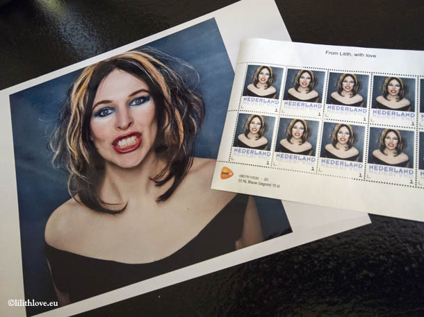 Een vel van 10 postzegels (nr 1) met daarop mijn zelfportret ‘The President’s wife’: € 29,50 (inc. verzending binnen Nederland). Ik kan het aan de achterzijde signeren als je dat graag hebt.