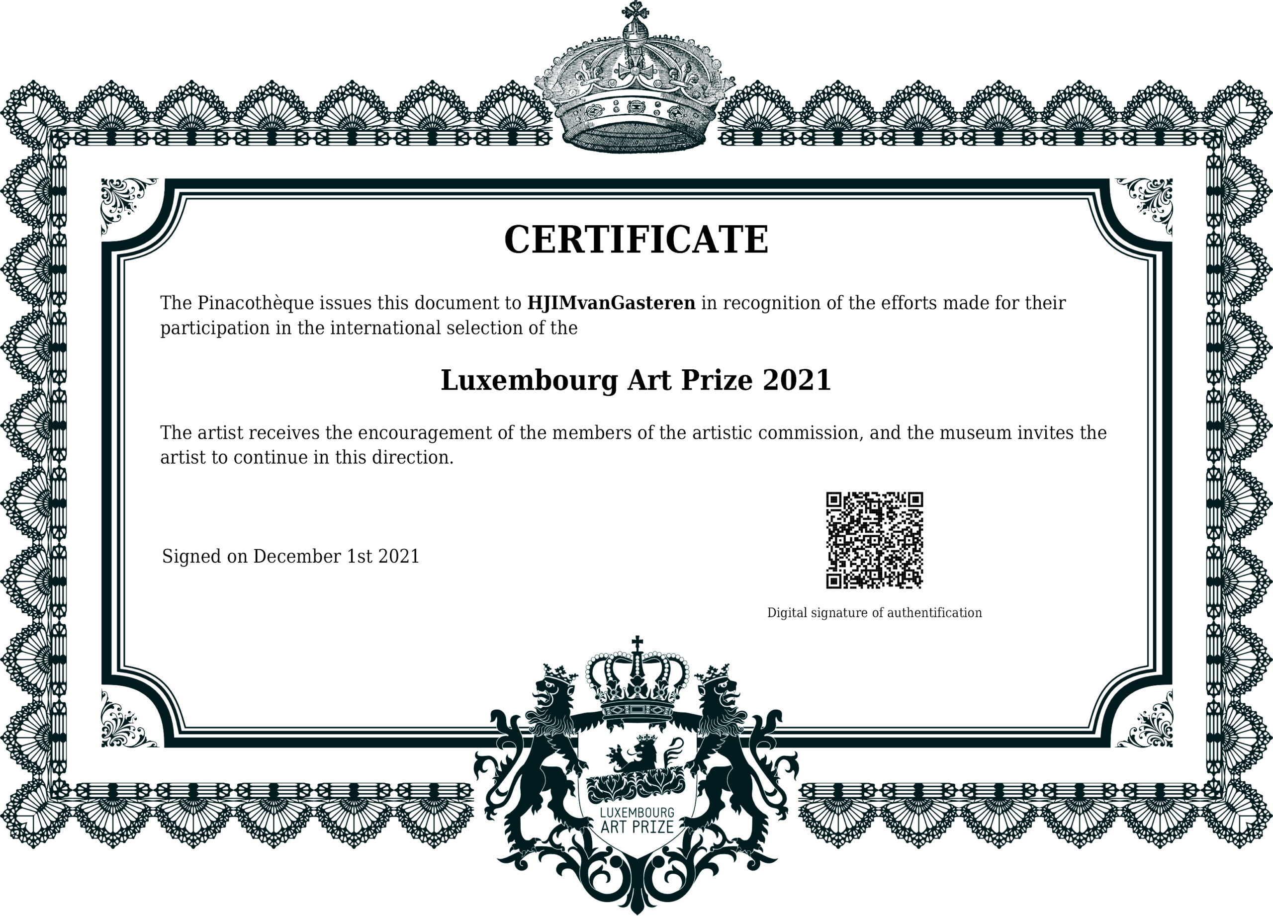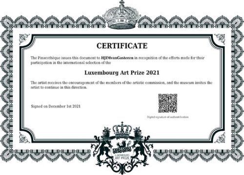 ‘Goed bezig!’ zegt Luxembourg Art Prize 2021 tegen mij via dit certificaat.