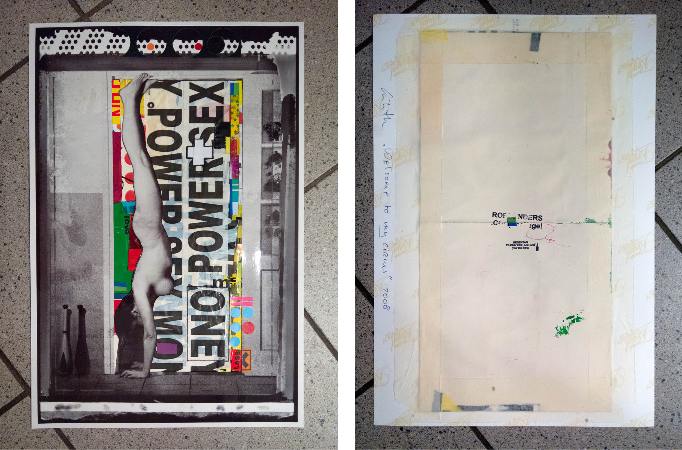 Rob Benders Regentag maakte ooit een collage van mijn zelfportret ‘Welcome to my circus’ uit 2008 (nogmaals hartelijk dank daarvoor!). De achterzijde is gesigneerd door beide kunstenaars. Afmeting: 30,3 x 45,5 cm. Het gaat om een originele foto, geen flutprintje op kopieerpapier. Op het origineel is vanzelfsprekend wel mijn tepel te zien. Op fb niet.