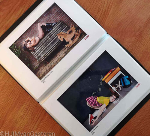 Vandaag de zelfportretten ‘Cowgirl having a break’ 2008 en ‘..CK The teacher, 2009 papiermaat 20×30 cm, afgedrukt op glanzend fotopapier. Prijs: € 50,00/stuk inc verzending binnen Nederland. Ineens bedenk ik hoe toevallig het is dat deze naast elkaar in de map zitten. Op beide heb ik namelijk spullen van mijn kinderen gebruikt. Het houten hobbelpaard dat mijn oudste kreeg toen ze werd geboren. Het schoolbankje waaraan ze alle drie hebben zitten knutselen. De een wat meer dan de ander. Enzovoorts. Ik schreef eerder dat al mijn zelfportretten bij elkaar mijn dagboek vormen en dat blijkt nu ook weer. Vaak schrijft men dat mijn werk geënsceneerd is. Ja en nee. Veel op mijn foto’s is gewoon zoals het is. En dan die melk op ‘..CK The teacher’ die uit mijn mond loopt? Ook dat klopt, ik houd niet van melk.