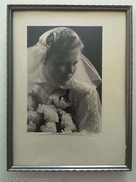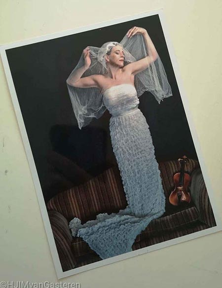 Vandaag het zelfportret ‘Daddy’s violin, 2009′, beeldmaat ca. 12×16,5 cm. Afgedrukt op Kodak Royal. Prijs: € 30,00 inc verzending binnen Nederland. Op deze foto te zien: mijn vaders viool (ik heb hem nooit horen spelen, hij zat vroeger in een bandje), mijn moeders trouwsluier, een bankje van tante Miep én een Ikea bedsprei met tape. Daar houd ik van, roeien met de riemen die ik heb. Geen trouwjurk voorhanden? Dan een bedsprei. Dit thema is te zien in mijn hele werk. Huishoudfolie, aluminiumfolie, cassave paneermeel, zand en geleende props enz.. Soms geven mensen me iets te leen, omdat het ze écht iets voor een zelfportret lijkt. Dan ligt dat item een tijdje en ineens… ontstaat er een zelfportret. Een ander thema in mijn werk is mijn geschiedenis. Vaak gebruik ik spullen uit mijn familie of van de kinderen die her en der door het huis slingeren. Mijn zelfportretten vormen tezamen mijn dagboek. Hierbij ook een trouwfoto van mijn moeder, waarop ze dezelfde sluier draagt.