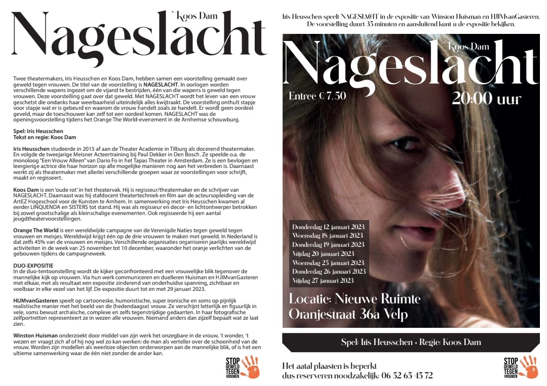 Twee theatermakers, Iris Heusschen en Koos Dam, hebben samen een voorstelling gemaakt over geweld tegen vrouwen. De titel van de voorstelling is NAGESLACHT.