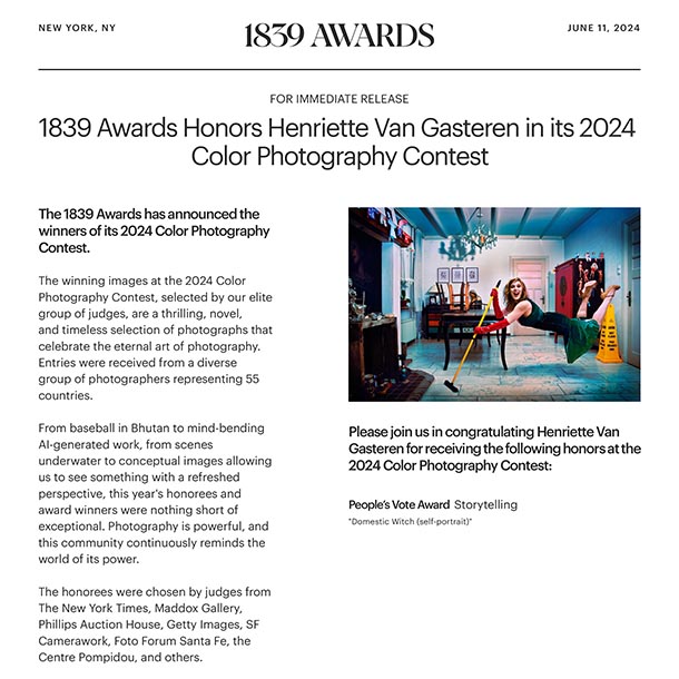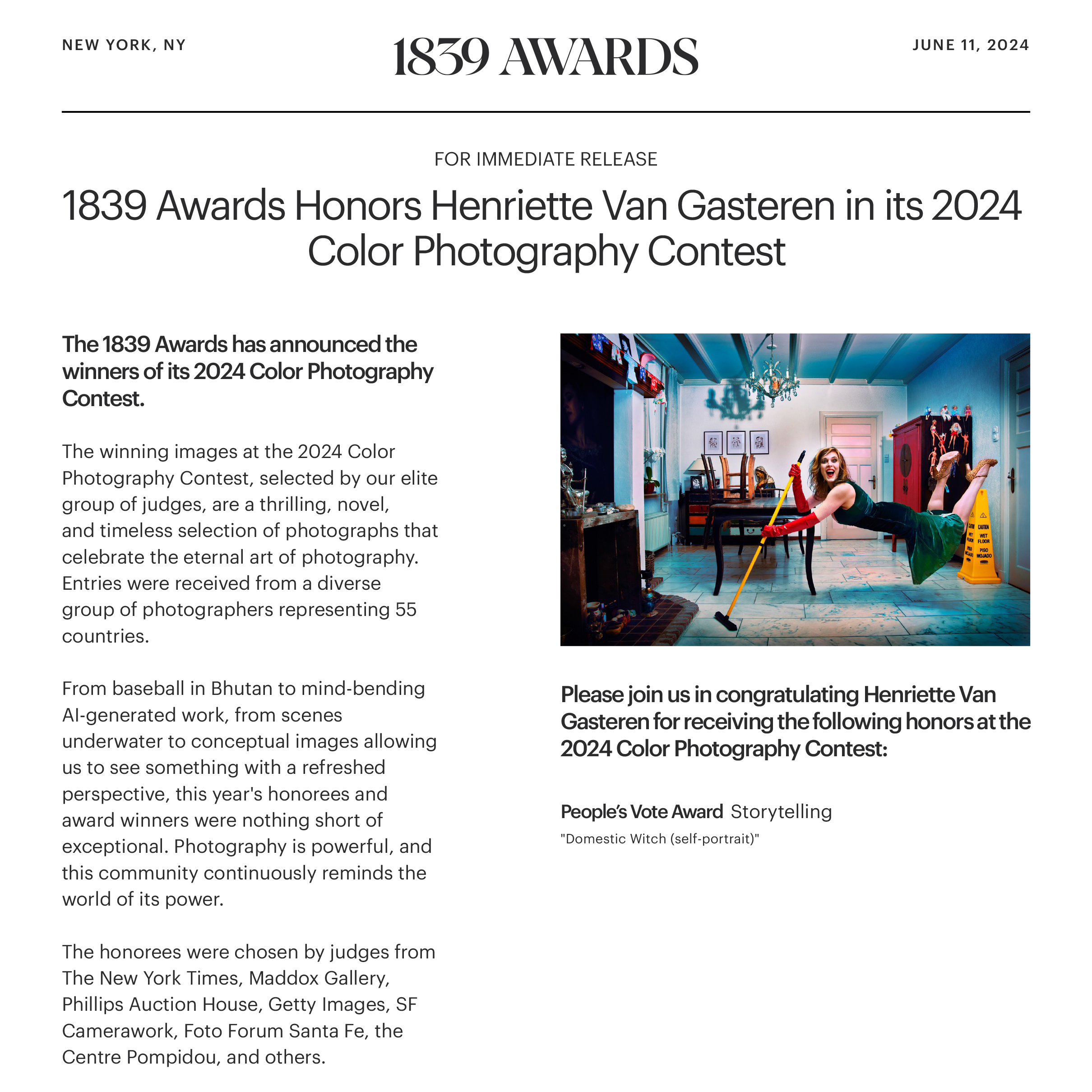 Kans op de People’s vote award bij de wedstrijd 1839 Awards Color Photography Contest, categorie Storytelling, met mijn zelfportret ‘Domestic Witch’. Dankjewel!