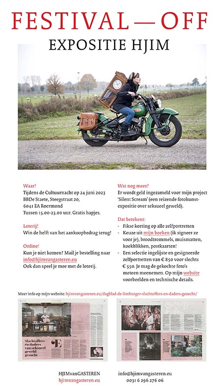 Mijn eerste boek met zelfportretten ‘A house is not a home’ is bijna uitverkocht, maar tijdens Festival-Off in Roermond verkrijgbaar voor 75 euro. Door aankoop steun jij mijn project ‘Silent Scream’ (seksueel misbruik). En wie weet win jij de week erna de helft van het aankoopbedrag terug! (P.S. Ik signeer het natuurlijk voor je als je dat op prijs stelt.) Preview klik hier: ISSUU