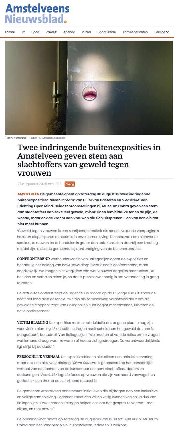 | Opening Femicide & Silent Scream | Zaterdag 30 augustus 2025 | 15:00 – 17:00 uur | Sandbergplein, tegenover het Cobra Museum, Amstelveen. (Silent Scream is te bezoeken in Museum Cobra en tevens gratis te bezichtigen in de ontvangsthal van het Politiebureau, Gerard Doulaan 2, Amstelveen) |