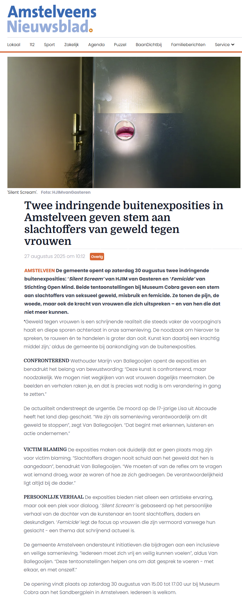 Quote NOS: In Amstelveen openen morgen twee exposities rond de thema’s vrouwengeweld en vrouwenmoord. Eén in het Cobramuseum en één op het plein ervoor. Silent Scream en Femicide heten ze. Multimediakunstenaar Henriëtte van Gasteren is de samensteller van Silent Scream en vertelt meer in NOS Met het Oog op Morgen.