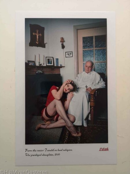 Vintage koopjes! Door mij goedgekeurde, gesigneerde, testfoto’s. Klein en groot. Vandaag het zelfportret ‘The prodigal daughter, 2010′. beeldmaat ca. 12×18,5 cm. Afgedrukt op Fujifilm Crystal Archive Paper Supreme. Prijs: € 30,00 inc verzending binnen Nederland. Mijn vader en ik op één zelfportret. Een verwijzing naar ‘de verloren zoon’ uit de bijbel. Ik liet hem de foto ooit zien en zei: ‘Je ziet wel mijn onderbroek.’ Dat was namelijk mijn bedoeling, ik moest een beetje snollerig en verloren eruit zien. Mijn vader bekeek de fotoafdruk en antwoordde: ‘Ach, Rembrandt schilderde ook vrouwen’. Hij bedoelde daarmee natuurlijk naakten. Ik hoorde ooit van een nichtje dat mijn vader in het begin erg veel moeite met mijn werk had gehad. Hij heeft me dat nooit gezegd. Ik wist dat desondanks, want zo goed kende ik mijn vader wel. Hij heeft een heel lange weg afgelegd om mij te begrijpen en om zelfs aan mijn zelfportretten mee te werken. Dat is zuivere liefde van een vader voor zijn kind. Zó kostbaar. Gisteren kwam op facebook als herinnering een foto uit de Corona-periode voorbij. Mijn vader in zijn pyjama in bed. In het verzorgingshuis. Armen wijd gespreid. Zó blij om mij eindelijk weer te mogen begroeten. Best heftig om zomaar ineens mee geconfronteerd te worden. Vandaar vandaag ‘The prodigal daughter’ te koop. Hierdoor zijn we opnieuw even met elkaar verbonden.
