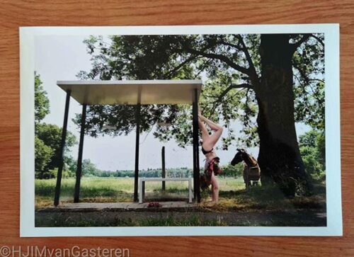 Dit zelfportret schoot ik op een mooie julidag. Samen met een bevriende fotograaf was ik onderweg in het Zuiden van Limburg. Ik ging graag met hem op pad om te kijken, te leren, te kletsen en te lachen. Vooral dat laatste. Toen ik deze abri zag, móest ik een handstandje doen en dit vastleggen. Schoenen uit en hup. Ik was voorbereid op (van)alles, vandaar die bikini onder mijn zomerjurk. Terwijl ik op mijn handen stond, regisseerde ik het paard door te klakken met mijn tong totdat het de goede kant op keek. Net toen ik weer met beide benen op de grond stond, kwam de bus eraan. De chauffeur stopte, ik zwaaide… en lachte.
